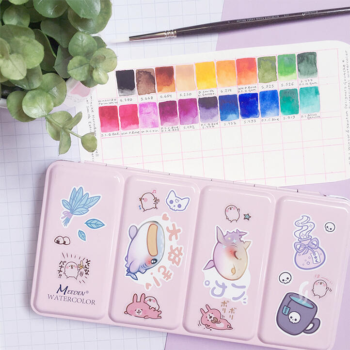 I’m currently using mainly Schmincke Horadam, Prima Marketing Pastel and Holbein Artists Pastel watercolors, Schmincke + Holbein being my favorites as they’re very vibrant and high quality paints.I usually prefer the ones that don’t granulate & come in watercolor tubes. I arrange the colors to a Meeden watercolor palette. I also like to use Finetec Coliro Pearlcolors for pretty shimmery details.